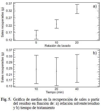 Para el análisis de varianza se determinaron disimilitudes entre los factores de los niveles establecidos, los cuales indican una diferencia significativa en la variable de respuesta causada por el factor relación solvente/residuo, con una repercusión poco significativa en la eficiencia del tratamiento pero sí en los recursos necesarios para ello. En el primer caso se señala una diferencia entre los niveles del tratamiento referidos a la remoción de Cr, donde la relación 1:20 posee un efecto mayor en el arrastre del metal, mientras que el tiempo no muestra una influencia significativa (Figs. 4a y 4b). De igual forma, la obtención de sales a partir del residuo muestra un mejor comportamiento si se utiliza un mayor volumen para realizar el lavado y al igual que en el caso anterior, el factor tiempo presenta una menor influencia en el tratamiento (Figs. 5a y 5b).