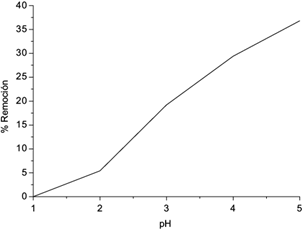 Los iones Pb2+ constituyen un ácido de Lewis, que forma enlaces covalentes coordinados con las moléculas de agua que lo rodean. Las reacciones consecutivas de hidrólisis se producen fácilmente, dando lugar a nuevas especies de complejos coordinados por uno o más cationes Pb2+ (Caccin et al. 2015). Diversos estudios han destacado que el pH es un factor importante e influyente en la adsorción de iones metálicos en solución acuosa (Li et al. 2009, Mohammadi et al. 2010, Moncilovic et al. 2011), ya que el pH condiciona la presencia en solución acuosa de todas las especies de Pb (Pb2+, Pb(OH)+, Pb(OH)2, Pb(OH)- 3, Pb(OH)4 2-, Pb2(OH)3+, Pb(OH)4 2+) (Liu et al. 2013) y también condiciona la superficie del material adsorbente. A valores de pH entre 1 y 6, la especie dominante es el catión disuelto Pb2+, a valores de pH más altos, se puede observar una formación PbOH+, Pb (OH)2, y Pb(OH)3 - (Depci et al. 2012, Caccin et al. 2015). Prado et al. (2014) establecen que la adsorción de iones Pb2+ debe darse en un pH igual o mayor que 4 y que es necesario establecer el rango de pH óptimo con ensayos de adsorción. En el estudio de remoción de iones Pb2+ que se presenta a continuación, se utilizó el carbón activado lavado con HNO3 al 2 %. Empleando 25 mL y 5 mg/L de iones Pb2+, se realizó un ensayo en el rango de 1 a 5 unidades de pH para evaluar el valor óptimo para la máxima remoción. En la figura 5, se muestra el comportamiento del porcentaje de remoción en función de la variación de pH, donde es evidente el incremento de la remoción de iones Pb2+ con el incremento de pH. Este resultado es similar a los hallazgos de Depci et al. (2012) que obtuvieron un valor máximo de remoción en el rango de pH de 4 a 5. Los resultados obtenidos pueden explicarse con base en la competencia entre los iones Pb2+ y H3O+ por ocupar los sitios ácidos en el carbón activado. A valores de pH bajos, existe un exceso de iones H3O+ que interfiere en la adsorción de iones Pb2+ en la superficie del carbón activado. Cuando el pH aumenta, los iones H3O+ sólo cubren la menor cantidad de superficie del carbón activado y dejan sitios disponibles para adsorber iones Pb2+, siendo el valor óptimo el de 5 unidades de pH que corresponde a un porcentaje de remoción de 36.8 % (Wang et al. 2010, Burke et al. 2013). Adicionalmente, se determinó el punto de carga cero pHPZC, utilizando la metodología de Valente-Nabais y Carrott (2006), cuyo resultado fue 4.85 indicando que la superficie del carbón activado es negativa (Saleh et al. 2013, Caccin et al. 2015), y corroborando que a pH 5, se generan fuerzas de atracción electrostáticas entre los iones dominantes Pb2+ y la superficie del adsorbente (Machida et al. 2012). Además, todos los valores de pH evaluados en este trabajo están por debajo de 5 para evitar la precipitación de iones Pb2+ en forma de hidróxido durante el proceso (Wang et al. 2010, Burke et al. 2013).