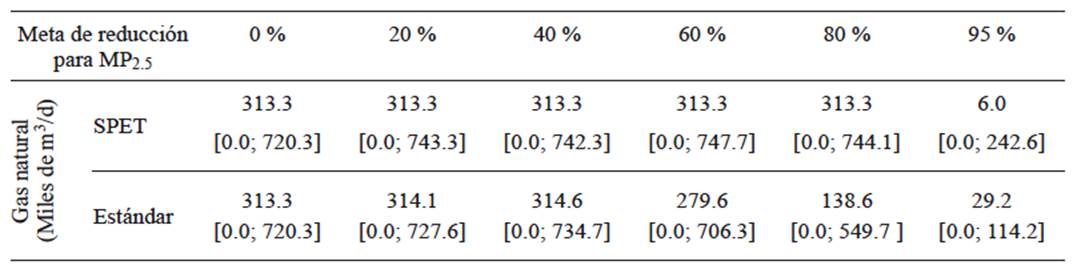 En el cuadro VI se observa que al aumentar la disponibilidad de gas natural los costos totales del SPET disminuyen. Además, para regulaciones que exijan hasta 80 % de reducción de emisiones de MP2.5 se obtendría un ahorro de costos, el cual se genera porque el precio promedio del gas natural en MMBTU es más bajo que el precio del petróleo núm. 2 y núm. 5. En consecuencia, ante una eventual mayor disponibilidad de gas natural las fuentes industriales que utilizan estos dos combustibles líquidos se cambiarían incluso sin exigencia de regulación. El ahorro máximo ocurre cuando existe un 100 % de disponibilidad de gas sin exigencia de reducción, llegando a 47.4 millones de dólares americanos. Con una meta del 95 % de reducción los costos totales del SPET con o sin disponibilidad de gas son similares y cercanos a los 30 millones de dólares, ya que para esa meta de reducción la sustitución de combustible no es una opción factible y las fuentes industriales deben optar por tecnologías de abatimiento.