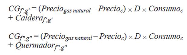 Estos dos últimos costos dependen del precio del combustible que se sustituye y el precio del gas natural, además del costo anualizado de la caldera (Caldera f',g' ) o quemador dual (Quemador f'',g'' ) que se requiera instalar. Las fórmulas para ambos costos son las siguientes, siendo c el combustible que se va a sustituir por gas natural: