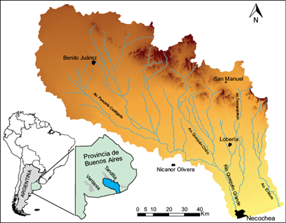 La CRQG ocupa un área de aproximadamente 12 000 km2 (Fig. 1) en el sudeste de la provincia de Buenos Aires, entre los sistemas serranos de Tandilia y Ventania. Esta porción del territorio bonaerense se denomina Llanura Interserrana, cuyo rasgo distintivo es la escasa pendiente y la presencia del río Quequén Grande, el cual es el principal curso de agua dentro de la cuenca y funciona a modo de colector del resto de los cursos superficiales. La zona reviste una gran importancia económica como consecuencia de la producción agrícola y ganadera, a la vez que en la desembocadura del río se encuentra emplazado el puerto de Quequén, uno de los principales puertos exportadores del país. El clima del área es subhúmedo seco, con nulo o pequeño exceso de agua a los efectos agronómicos y conforme a su eficiencia térmica, de tipo mesotermal “B2” (Thornthwaite 1948). Los valores anuales de precipitación se encuentran entre 698 y 1289 mm/año para los últimos 14 años, con un promedio de 907 mm/año (Quiroz Londoño et al. 2012).