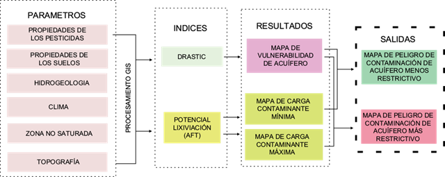 Para evaluar el peligro de contaminación del acuífero Pampeano se consideró la interacción entre la vulnerabilidad del acuífero y la carga contaminante que podría llegar al mismo como resultado de las actividades humanas en la superficie. De esta forma, para evaluar la vulnerabilidad se consideró una metodología clásica como es el índice DRASTIC y para la carga contaminante se evaluó la lixiviación potencial de plaguicidas mediante el índice AFT (Fig. 3, Cuadro I). Para evaluar Para evaluar estos índices en el área estudiada se aplicaron las distintas ecuaciones en cada pixel trabajando en entorno ARCGIS 9.3 (ESRI 2007).