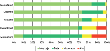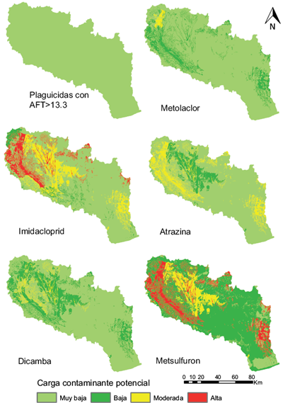 El resto de los plaguicidas presentó, en al menos alguna porción de la cuenca, un AFT menor a 13.3, siendo su capacidad de lixiviación entre poco probable y hasta probable. De tal manera, se estableció un orden de probable lixiviación a partir del promedio de los AFT calculados: Metsulfuron > Imidacloprid > Dicamba > Atrazina > Metolacloro (Fig. 6). Esta mayor capacidad de lixiviación está relacionada con el valor de Koc, en general menor que el grupo anterior y además un T1/2 que se mantiene en el mismo orden. Este comportamiento es similar al de plaguicidas de características similares reportado en otros estudios (Spadotto et al. 2002). Se destaca el Metsulfuron, con el menor valor de AFT, producido no solo por su bajo Koc, sino también por su elevado T1/2 relativo, por lo que el tiempo que permanecerá en el suelo antes de su degradación será mayor, lo que aumenta la posibilidad de que llegue al acuífero (Mattos y Silva 1999).
