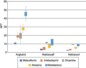 Si se consideran los índices obtenidos según los tres grandes grupos de suelos predominantes en la cuenca (Fig. 2), se observa que para todos los compuestos los índices AFT son mayores para los suelos Argiudoles (Fig. 7), lo que indica que en estos, la probabilidad de lixiviación es menor que en los suelos restantes (Natracuoles y Natracualfes). Tal situación, se condice con los mayores espesores del horizonte A y mayor contenido de materia orgánica de los Argiudoles, lo que favorecería una mayor retención en el perfil del suelo y la degradación de estos compuestos, resultados similares a determinados por diversos autores previamente (Spark y Swift 2002, Larsbo et al. 2009, Takeshita et al. 2019).