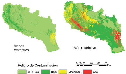 Para cargas contaminantes bajas debidas al uso de plaguicidas con alto Koc relativo o bien a su aplicación en sectores con mayores espesores de horizonte A, sería suficiente para establecer medidas de gestión el uso de los mapas obtenidos a partir de los índices de lixiviación, debido a que la probabilidad es tan baja que se puede prescindir de la vulnerabilidad del acuífero. Por otro lado, si se consideran cargas potenciales mayores, al tener en cuenta en la gestión tanto el mapa de carga contaminante como el de vulnerabilidad, el mapa de peligro obtenido permite establecer medidas menos restrictivas que al considerar cualquiera de los dos mapas previos.
