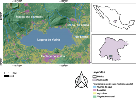 La Laguna de Yuriria (sitio RAMSAR 1361) se ubica en la Mesa Central; pertenece a la región hidrológica Lerma-Chapala-Santiago y tiene una superficie de 58.91 km2. Geográficamente se localiza entre los municipios de Yuriria, Salvatierra y Valle de Santiago, en el estado de Guanajuato, México (Fig. 1 ). Su cuenca de captación se ubica en los municipios de Yuriria, Uriangato, Moroleón, Salvatierra, Valle de Santiago, Jaral del Progreso y Santiago Maravatío en Guanajuato, y los municipios de Puruándiro, Villamorelos, Huandacareo y Cuitzeo en Michoacán (Sandoval-Minero 2004).