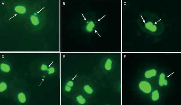 Fig. 1 Erythrocytes of Boana pulchella tadpoles (630X). A: normal cell (dotted arrow) and presence of micronucleus (MN, white arrow). B: Cell with two MN (white arrow) and nuclear aberration: kidney-shaped (dotted white arrow). C: MN (white arrow) and nuclear aberration: notched (dotted white arrow). D: Bridge (white arrow) and MN (dotted arrow). E: binucleate cell (white arrow) F: lobed nucleus (white arrow).