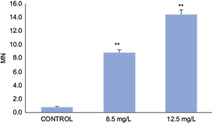 Fig. 2 Micronuclei (MN) frequency (per 1000 erythrocytes) in Boana pulchella tadpoles after 48 h of exposed to different concentrations of Picloram (Tordon 24K). Bars represent the mean ± SEM (standard error of the mean). The significant difference was **p ˂0.01 with respect to the control (binomial proportion test).