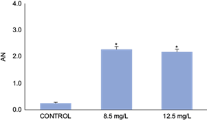 Fig. 3 Frequency of nuclear aberrations (AN) in erythrocytes (per 1000 red blood cells) in Boana pulchella tadpoles at 48 h of exposed to different concentrations of Picloram (Tordon 24K). Bars represent the mean ± SEM (standard error of the mean). The significant difference was *p ˂0.05 with respect to the control (binomial proportion test).