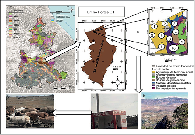 La comunidad Emilio Portes Gil pertenece al municipio de San Nicolás Buenos Aires, Puebla, México (19º18’ 30” N, 97º51’ 00” W) y está situada a 2350 msnm. El clima de la región es semiárido, templado y con lluvias en verano. Su principal actividad económica es la agricultura de riego. El número de habitantes es de 2174. La zona presenta una alta incidencia de casos de brucelosis animal (30 %) y humana (10 %), con referencias históricas desde 1923, fecha que coincide con los primeros registros de importación de cabras murcianas-granadinas (españolas) en la zona (Cruz-Aviña et al. 2022). En estos suelos, cuyos sitios se muestran en la figura 1, el ganado caprino pastorea y transita itinerante en la zona, de manera extensiva y sin control de buenas prácticas.