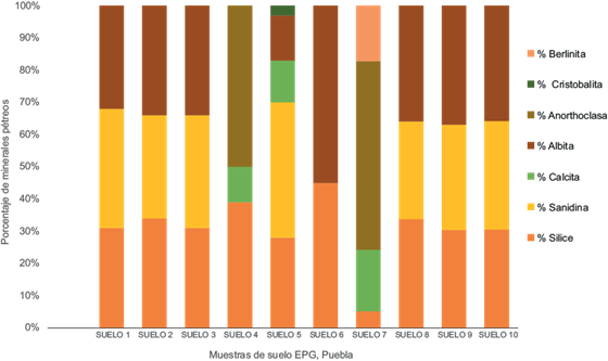 En la figura 2 se aprecian los principales minerales petrogénicos detectados en las muestras de suelo analizadas. De acuerdo con los resultados del análisis en la comunidad Emilio Portes Gil predominan los minerales pétreos: albita, sanidina y sílice, siendo los de menor proporción la calcita y la cristobalita.