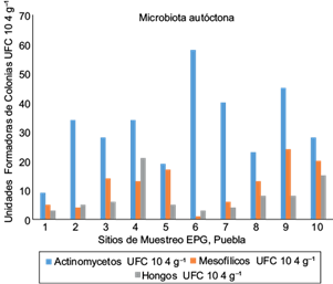 Se muestran los resultados (en porcentajes) del análisis de microbiota autóctona para hongos, organismos mesolíticos y actinomicetos en cada una de las muestras (Fig. 2). Nuestros resultados indican que los actinomicetos constituyen un componente significativo de la población microbiana del suelo (casi un millón por gramo de suelo); en segundo término, están los organismos mesofílicos. Entre los organismos termófilos se encuentran los géneros Clostridium, Streptomyces, Chaetomium y Humicola, presentes en el estiércol y los vegetales en descomposición. El ANDEVA arrojó una interacción significativa para la combinación Shannon-sitio: F(5,9) = 4.0068, p = 0.0344). Los microbios celulolíticos del suelo son principalmente mesófilos (Fig. 3 ).