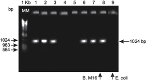 Se amplificó el gen bp26/IS711, que es específico del género Brucella, con 1029 pb [pares de bases]. El gen bp26 codifica la proteína BP26 (Omp28) que es un antígeno inmunodominante en la infección de Brucella sp. en fauna y humanos. Carril M, (marcador molecular), carriles 1-7 muestras problema (ADN bacteriano purificado a partir de suelo agrícola) (57 %), y se compararon con el testigo positivo (ADN de Brucella melitensis vacunal BM16) (+) Carril 8 (ADN de E. coli) y en el Carril 9 como testigo negativo (-) (Fig. 4, Cuadro II).