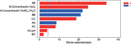 Fig. 2 Diagrama de Pareto del proceso Fenton. (A: concentración de sulfato ferroso heptahidratado [FeSO4•7H2O]; B: concentración de peróxido de hidrógeno [H2O2]; C: potencial de hidrógeno [pH].)