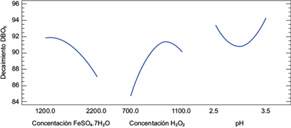 A partir de la figura 3 se puede inferir que el incremento en la concentración del catalizador FeSO4•7H2O hasta 2200 mg/L tiene un efecto negativo en el decaimiento de la DBO5, debido a que se excede el rango óptimo de dosis de catalizador. Por el contrario, el incremento en la concentración de H2O2 favorece el decaimiento de la DBO5 por la mayor generación de radicales •OH. Finalmente, en cuanto al pH, se logró una reducción del 94 % de la DBO5 en el rango de 2.5-3.5. Según Wang et al. (2016) , el rango óptimo de pH para la degradación de la mayoría de los compuestos orgánicos es de 2.5 a 3.0.