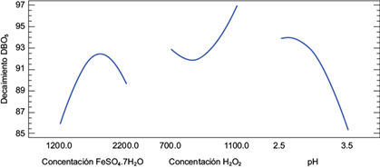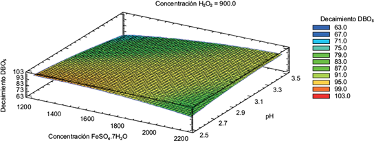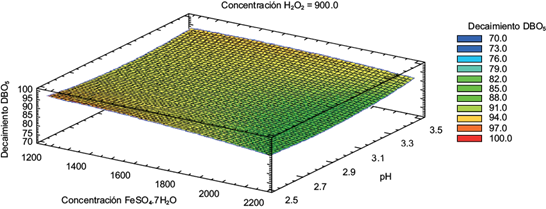 La figura 7 muestra que el porcentaje más alto de decaimiento de la DBO5 mediante el proceso foto-Fenton corresponde a un 95 %, con una concentración de FeSO4•7H2O = 1400 mg/L, pH de 2.5 y un valor intermedio de la concentración de H2O2 = 900 mg/L.