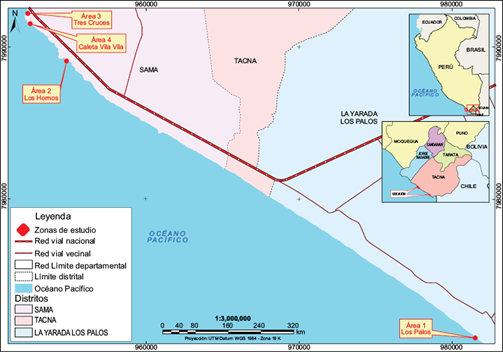 Tacna cuenta con 25 playas, de las cuales se estudiaron cuatro (DIRESA 2020). La elección de las playas para el estudio se basó en el estudio de DIRESA Tacna del año 2020, considerando dos playas con la categorización de “Saludable” (Fig. 1): a) Los Palos (Latitud: -18.2971 y Longitud: -70.4477, ubicada en el kilómetro 1317, a 15 km de la Panamericana región Tacna, provincia Tacna, distrito La Yarada) y b)Tres Cruces (Latitud: -18.0842 y Longitud: -70.755, ubicada en el km 1254 a 44 km de la Panamericana región Tacna, provincia Jorge Basadre, distrito Sama). Se incluyeron también dos playas con la categorización de “No saludable” (Fig. 1): a) Caleta Vila Vila (Latitud: -18.1174 y Longitud: -70.727, que se ubica en el kilómetro 1304, a 35 km de la Panamericana región Tacna, provincia Tacna, distrito Tacna) y b) Los Hornos (Latitud -18.1401 Longitud: -70.7019, ubicada en el kilómetro 1303, a 40 km de la Panamericana región Tacna, provincia Tacna distrito Tacna).