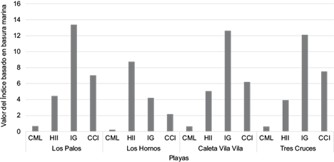 Con los datos obtenidos en el IG (Cuadro IV) las playas Los Palos, Caleta Vila Vila y Tres Cruces están en la categoría de “Sucio”, mientras que la playa Los Hornos está en la categoría “Limpio”. Con los datos obtenidos con el CCI (Cuadro IV) se determinó que las playas Los Palos, Caleta Vila Vila y Tres Cruces están en la categoría de “Moderado”, y que la playa Los Hornos está en la categoría “Limpio”, para ambos índices.