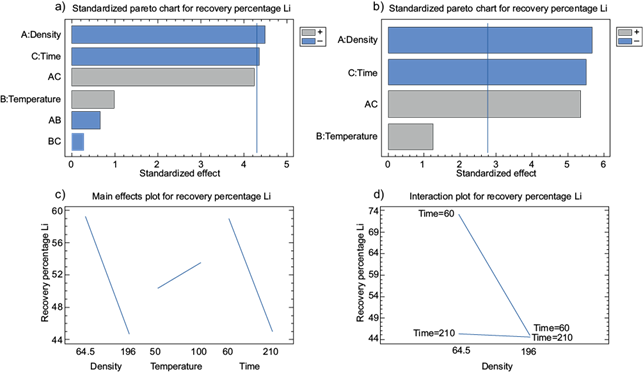 Fig. 3 Lithium recovery. a) Pareto diagram of variables influence, b) adjusted Pareto diagram of variables influence, c) influence graph of individual variables, d) influence graph of interactions of significant variables.