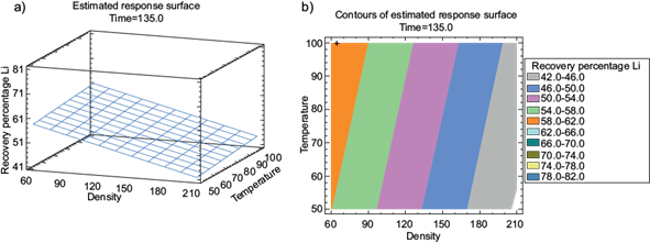 The surface graph shows the recovery response to the parameter’s variation during leaching. With 135 min the effect of density is noticeable in figure 4a, and it displays higher efficiency when it is around 60 g/L. Similarly, the contour plot in figure 4b, shows that with 135 min, a Li recovery efficiency of 62% was achieved (orange region), which increases as the temperature approaches 100 ºC and the density decreases to 60 g/L.