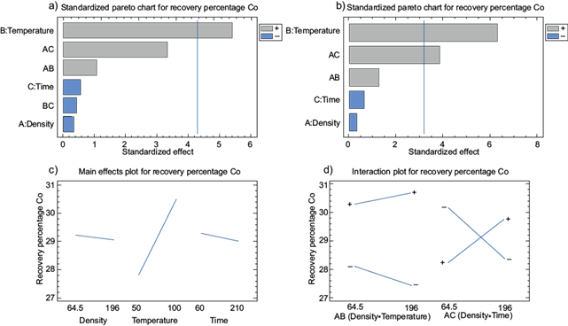 Fig. 5 Cobalt recovery. a) Pareto diagram of variables influence, b) adjusted Pareto diagram of variables influence, c) influence graph of individual variables, d) influence graph of interactions of significant variables.