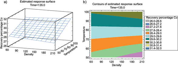 The surface graph shows the variation of parameters during leaching. In figure 6a. With 135 min, the effect of temperature is pronounced and shows greater efficiency at 100 ºC. Similarly, the response contour (for a time of 135 min) shows a higher Co recovery efficiency (30.8 %) in the upper region in figure 6b. The efficiency increases as the temperature approaches 100 ºC and density increases to the higher range.