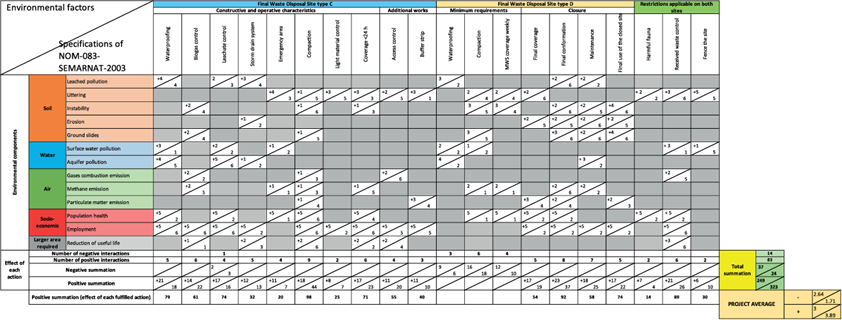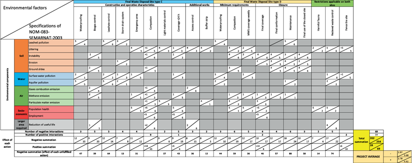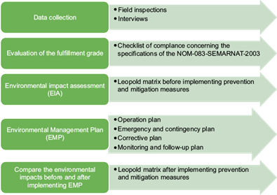 After the evaluation of the fulfillment grade of NOM-083-SEMARNAT-2003 (SEMARNAT 2004), information about the description, infrastructure, and fulfilled or unfulfilled specifications of both FWDS was used to identify actions that generate impacts on environmental factors (air, water, soil, etc.).