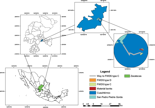 From the information on MSW generation provided by the municipal authorities, the actual FWDS was classified as type C and the closed FWDS as type D according to the Mexican Official Standard NOM-083-SEMARNAT-2003 (SEMARNAT 2004), as shown in table I. The operation mode used in FWDS type C is the combined method (trench and ramp methods), which consists of a ditch of approximately 40 cm created so that later MSW is deposited (as far as the ground allows it) in layers forming terraces over the respective area.