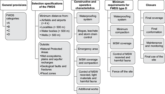 Table IV summarizes the number of specifications fulfilled and unfulfilled concerning the specifications for the selection of both FWDS, the constructive and operative characteristics, and the additional works of the FWDS type C, along with the minimum requirements and closure of the FWDS type D. The FWDS type C complied with 40% of the specifications, while the FWDS type D only with 38%. Thus, from these results, both FWDS were considered uncontrolled sites.