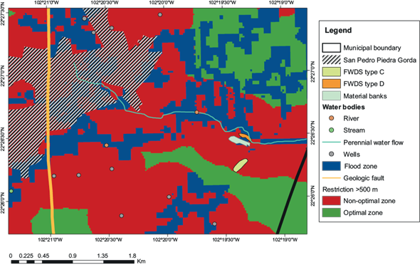 The assessment of the location restrictions or minimum distances (Fig. 4) for both FWDS was performed with a GIS and multi-criteria weighted overlay analysis. The optimal and non-optimal zones were identified in green and red colors. An optimal zone is a site that fulfills all the location restrictions established by the Mexican Official Standard. A non-optimal zone is a site that does not comply with at least one of the restrictions. The results of this analysis are shown in figure 4. The two FWDS were in the non-optimal zone (red color) since they are located at a distance less than 500 m from streams. Furthermore, the FWDS type D is situated in a flood zone with a return period of 100 years, so it must be verified that there will be no flow obstruction in the flood area or the possibility of landslides or erosion that affect the physical structure of the FWDS in case of an extreme precipitation event.
