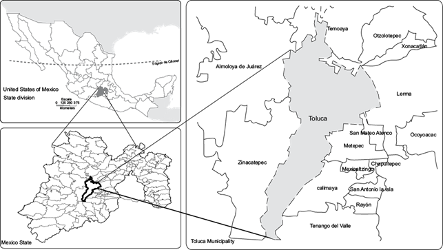 OFMSW samples were taken from two different locations in the municipality of Toluca (99º 46’ 56.64”-99º 31’ 43.32” W, 19º 04´07.68”-19º 29’ 31.92” N) (Fig. 1). The first sample (household waste, HW) was gathered from 52 nuclear single-family homes. These households located in different towns within the municipality of Toluca, which routinely performed a primary separation of their waste (e.g., organic and inorganic), were made up of a head, a spouse, and unmarried children (Ojeda-Benítez et al. 2008) . The second sample was collected from a temporary municipal deposit (MD), located at 19º 17’ 52.7” N, 99º 40’ 22.7” W, in La Teresona. The methodology proposed by Fazenda and Tavares-Russo (2016) and ASTM (2008) were followed for both samples. In this work, samples were collected during three months (February, March, and April) three times a week, totaling 36 samples. At the sampling site, a determination of volumetric weight was carried out following Mexican regulations (SECOFI 1985a).