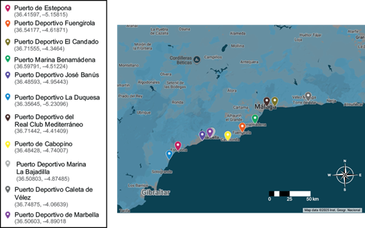 The Mediterranean Sea is a continental sea that connects to the Atlantic Ocean through the Strait of Gibraltar and to the Indian Ocean through the Suez Canal. Surrounded by the continents of Europe, Africa, and Asia, this sea, with an area of approximately 2.5 million km² and a length of 3860 km, is the second-largest inland sea on the planet, surpassed only by the Caribbean Sea. Its pollution is not only due to occasional accidents, but also to commercial and tourist activity. In the case of coastal areas of the Mediterranean Sea, such as Costa del Sol (Málaga and Granada, Spain), a large part of this pollution is due to the increase in tourist and recreational activities, due to the use of motor boats (cruises, yachts, sport fishing boats, etc.). Malaga is one of the main tourist destinations on the Iberian Peninsula, welcoming approximately 2.6 million travelers between June and August 2023, with tourism increasing by 4.8% since 2022 (CSM 2023, DPM 2024). In addition, in relation to tourism revenue, an increase of 10.1% was estimated from 2022. Currently, the province of Malaga has 11 marinas along its coast (Fig. 1).