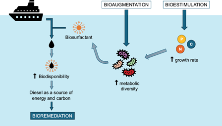 Biostimulation increases biodegradation rates by adding essential nutrients, such as nitrogen and phosphorus, to the medium (Luo et al. 2024), while bioaugmentation leverages the degradative capacities of different microorganisms to eliminate all compounds of the pollutant in question (Luo et al. 2024). Furthermore, the use of bacterial biosurfactants increases the availability of hydrocarbons in the marine environment as a potential energy and carbon source (Varjani and Upasani 2017, Goveas et al. 2022).