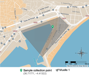 The sampled water comes from an area of Muelle Uno that contained a fuel slick, close to the docking area for recreational motorboats (coordinates 36.717713, -4.413229) (Fig. 3). The water temperature was 15 ºC (ST 2024). A total of 1 L of water was sampled from three different points. They were then transported to the laboratory at a cold temperature for processing.