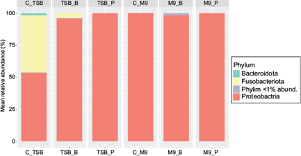 All M9 media were mainly represented by sequences belonging to the Proteobacteria phylum (> 95%), whereas the TSB media supported the growth of different phyla depending on the experimental condition.