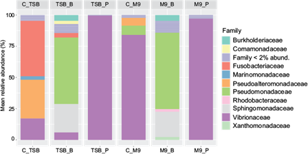 In figure 5, the M9 control (C_M9) is mainly represented by the Vibrionaceae family (> 75%), along with others such as Pseudomonadaceae (> 5%) and Pseudoalteromonadaceae (> 5%) to a lesser extent. In the TSB control (C_TSB), the presence of the families Fusobacteriaceae (> 35%), Pseudoalteromonadaceae (> 25%), and Vibrionaceae (< 20%) was observed. Benzene limited the growth of the Vibrionaceae family in both media M9_B and TSB_B. Moreover, the presence of benzene increased microbial diversity, with a greater number of bacterial families being represented. Among them, the Pseudomonadaceae family was dominant in both M9_B and TSB_B. This hydrocarbon also promoted the growth of the Sphingomonadaceae and Burkholderiaceae families to a lesser extent, whose relative abundances were not influenced by the media’s nutritional composition. The families Rhodobacteraceae (< 10%) and Xanthomonadaceae (< 10%) appeared exclusively in M9_B, whereas Comamonadaceae grew only in TSB_B (< 10%). The presence of pentane increased the abundance of the Vibrionaceae family by over 90%, both in the M9 (M9_P) and TSB (TSB_P) media.