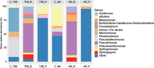 The C_M9 control was mainly represented by the genera Vibrio sp. (> 40%) and Aliivibrio sp. (> 30%), both belonging to the Vibrionaceae family, together with Pseudomonas sp. (< 15%) and Pseudoalteromonas sp. (< 15%) to a lesser extent. The abundance of the genera corresponding to this family decreased below 15% in the TSB control, in favor of the genera Fusobacterium sp. (< 40%) and Pseudoalteromonas sp. (> 30%). The addition of benzene inhibits the growth of Aliivibrio sp. and decreases the relative abundance of Vibrio sp. and Fusobacterium sp. in TSB_B to below 10%. In minimal media, benzene prevents the development of all genera of the Vibrionaceae and Fusobacteriaceae families. Benzene conditions are mainly represented by the genus Pseudomonas sp. (> 40%), as well as others such as Blastomonas sp., Burkholderia sp. and Sphingopyxis sp. to a lesser extent. This hydrocarbon also promotes the minor appearance of Acidovorax sp. in TSB media, as well as that of Pseudoxanthomonas sp. in M9 media. M9 media with pentane (M9_P) were mostly represented by Vibrio sp. (>90%), while the presence of this hydrocarbon in TSB media (TSB_P) also allowed an abundance greater than 5% of the genus Aliivibrio sp. (Fig. 6)