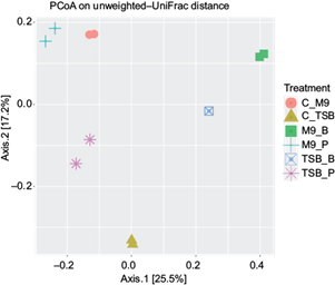 Principal coordinate analysis (PCoA) allowed us to study how distinct the bacterial communities were between the different experimental groups, as well as possible differences within samples of the same experimental condition (Fig. 7).