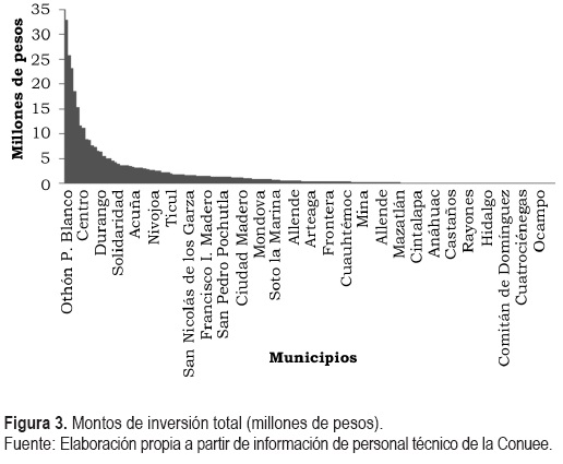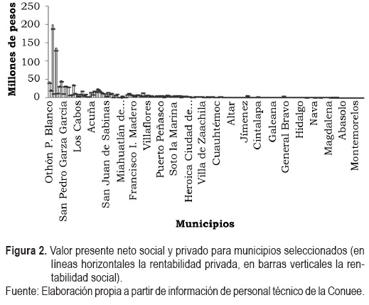Con una inversión de 335.5 millones de pesos (mdp), se obtendrían beneficios sociales que ascendían a 1149.3 mdp. La inversión promedio por municipio ascendía a 2 mdp, y el valor presente neto (VPN) de estas inversiones a una tasa de 12% era de 6.8 mdp en promedio. La TIR, en promedio, era de 63%, y finalmente, el plazo de retorno de la inversión era desde 32 meses en promedio, para una tasa de interés de 4%, de 36 meses a una tasa de 8% y de 45 meses a una tasa de 12%.