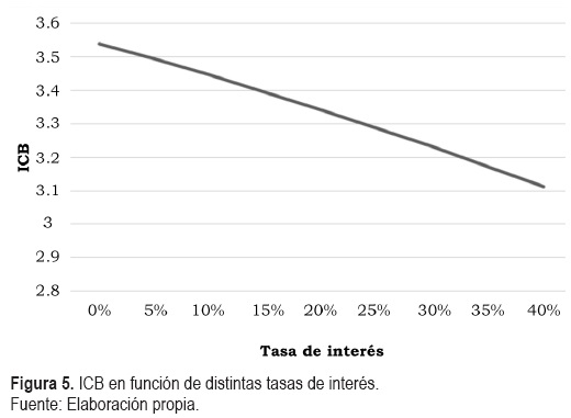 Se realizó un ejercicio para identificar cómo varía el ICB cuando se considera un apalancamiento de 30% y un crédito a tres años a distintas tasas de interés. En la figura 5 se puede observar que este índice es poco sensible a cambios en la tasa de interés.