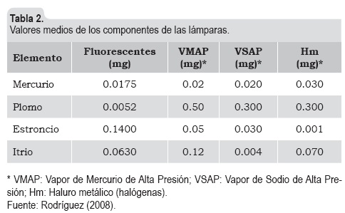 El tipo de tecnologías que en la actualidad opera en los municipios del país tiene el potencial de generar residuos peligrosos que afectan el medio ambiente. La tabla 2 muestra el contenido de mercurio para cada tipo de tecnología. Como se puede ver, las lámparas de vapor de mercurio, el vapor de sodio y fluorescentes tienen el mayor potencial para generar emisiones directas de mercurio al medio ambiente. De acuerdo con Poulin & Gibb (2008), una cantidad de apenas 0.02 mg de mercurio en el aire genera sutiles signos de toxicidad en el sistema nervioso central.