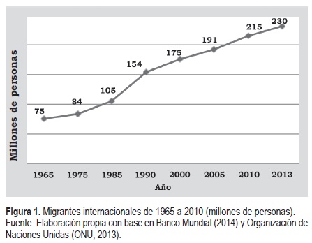 Los volúmenes de migración avalan esta hipótesis, ya que entre 1965 y 1985 el número de migrantes a nivel internacional creció tan sólo un 40%, para aumentar de 75 a 105 millones, respectivamente. Sin embargo, en el mismo periodo de tiempo ocurrido entre 1985 y 2005, el incremento fue de 82%, al crecer de 105 a 191 millones de migrantes. En los siete años transcurridos entre 2005 y 2013, la población que vive en un país distinto al de su nacimiento se incrementó a 39 millones, de 191 a 230 millones, según se muestra en la figura 1.