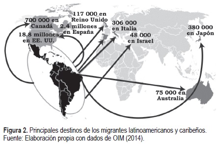 La diversificación de la migración latinoamericana ha dado paso al establecimiento de comunidades latinas, principalmente en los Estados Unidos de América y España, y recientemente en varios países de la Unión Europea, Asia, el Medio Oriente y Oceanía; como ejemplo se pueden mencionar los argentinos y uruguayos en Italia y Francia, los chilenos y argentinos en Australia e Israel, brasileños y peruanos en Japón y caribeños en Holanda y Reino Unido (figura 2).