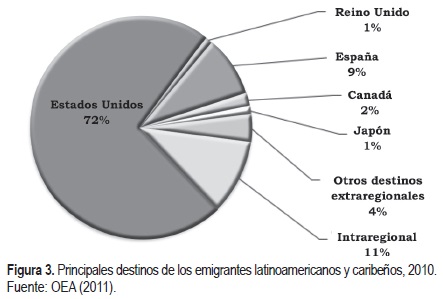 Como se puede apreciar en la figura 3, los Estados Unidos de América constituyen el principal destino para los migrantes latinoamericanos (en particular mexicanos y salvadoreños), con más de 18 millones, según señala el Pew Research Center (2011). En segundo lugar se encuentra España con poco más de 2.4 millones, y después Canadá con 700 000 inmigrantes (Organización de los Estados Americanos [OEA], 2011).