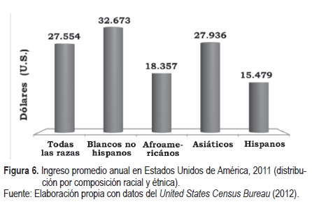 Respecto a los ingresos de los migrantes latinoamericanos en Estados Unidos, los datos de 2011 muestran que el promedio de la población en ese país fue para los de raza blanca de 47 000 USD anuales, mientras que si se considera sólo a los de origen latinoamericano (nativos y no nativos), el ingreso promedio anual disminuye a 29 000 USD, y hasta de 25 000 USD para los latinos no nativos (Pew Research Center, 2012).