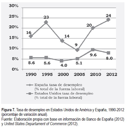 Las expectativas en el rubro del ingreso no parecen favorecer a los migrantes latinoamericanos, especialmente a los que se encuentran en España, ya que, como se muestra en la figura 7, las tasas de desempleo se han incrementado gradualmente entre el 2000 y 2005, hasta alcanzar en 2012 índices del 24% del total de la fuerza laboral en España y 8% en la de los Estados Unidos.