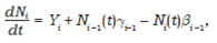 donde las cantidades son ahora indexadas por el orden, en el cual aparecen dentro de una secuencia dada, y γi-l es la probabilidad de transmutación de que se forme el núclido del elemento N i . Las soluciones de cada cadena lineal determinan una densidad parcial del núclido N i y se calcula por la siguiente ecuación: