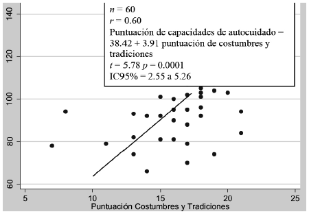 Figura 2 Correlación y regresión lineal entre puntuación de capacidades de autocuidado y de costumbres y tradiciones, Cerro de Ortega, Colima 2012 (n = 60).