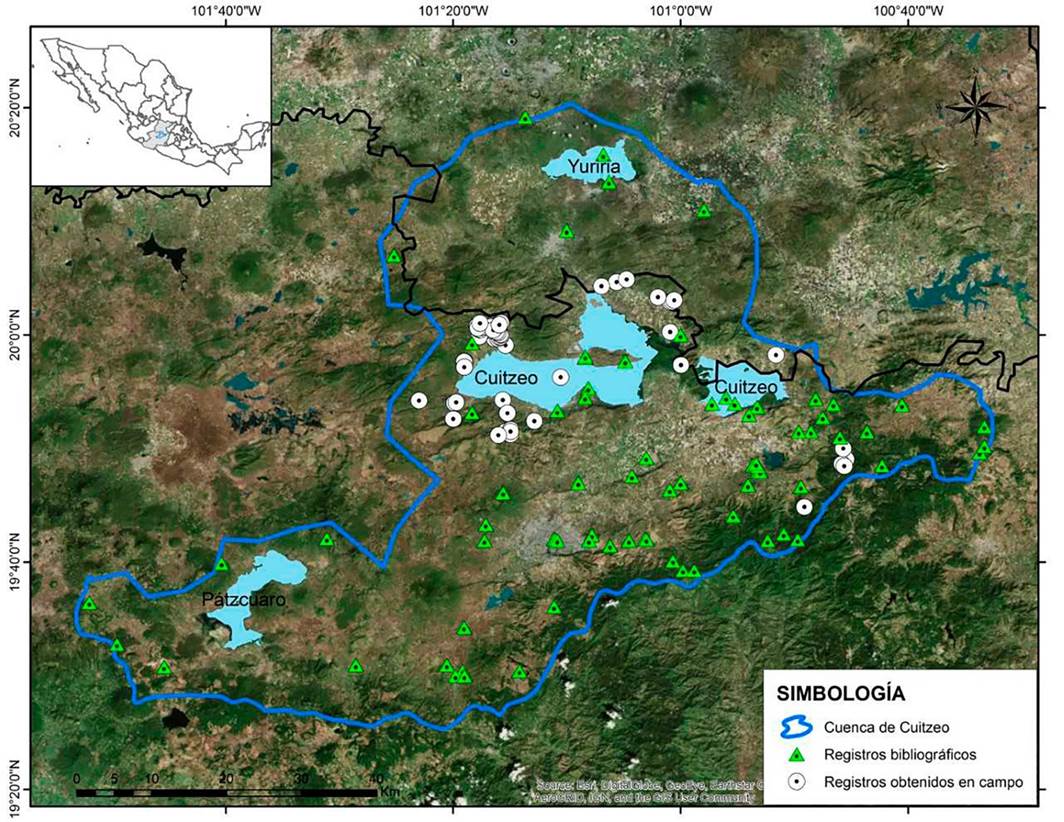Se analizó la información disponible para la cuenca de Cuitzeo (Michoacán y Guanajuato) en bases de datos de la Conabio. En ellas se dispone de 9186 registros para Michoacán provenientes de diez proyectos de investigación que incluyen colectas de entre 1892 y 1997. Un total de 576 registros correspondieron a localidades de la cuenca de Cuitzeo. Los proyectos de los que se obtuvo más registros fueron Álvarez-Solórzano & López-Vidal (1998), López-Wilchis (2018) y Ceballos (2002), con 405, 83 y 50 registros, respectivamente.
