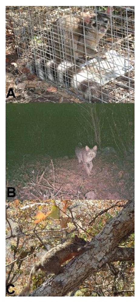 Se capturó un cacomixtle (Bassariscus astutus), además se colectó un gato montés (Lynx rufus) que fue atropellado en la autopista Morelia-Salamanca.